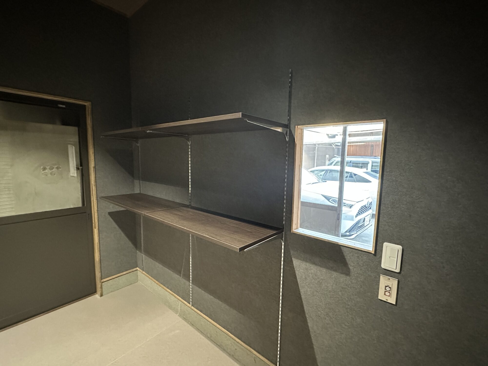 作業スペースには使い勝手の良い可動棚を設置、その横には作業をしながら隣の設備が確認出来る小窓を追加、合せて設備の操作ができるスイッチも類も一箇所にまとめました。