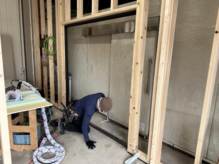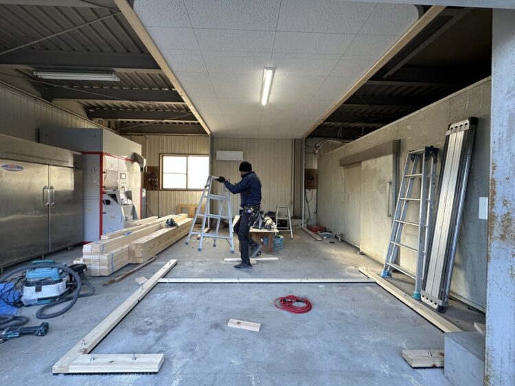 食品を扱う場所だからこそ、 「空間を整えること=品質を守ること」 と考え環境づくりからご提案させて頂きました。 毎日使うからこそ、使いやすさも大切に この場所は、日々の作業の中心となるスペース。 単なる作業場ではなく、長時間過ごす空間として 照明や壁紙も一緒に選定し、清潔感のある仕上が りにしました。 そしてもう一つ大きなポイントが「床」です。 お米などの重量物を頻繁に運搬するため、床材 にはキズに強いフロアタイルを採用。 台車での移動を前提に、耐久性を重視しました。 さらに、段差をできるだけ解消し、サッシ部分の 開口寸法もスムーズに通れるように調整。