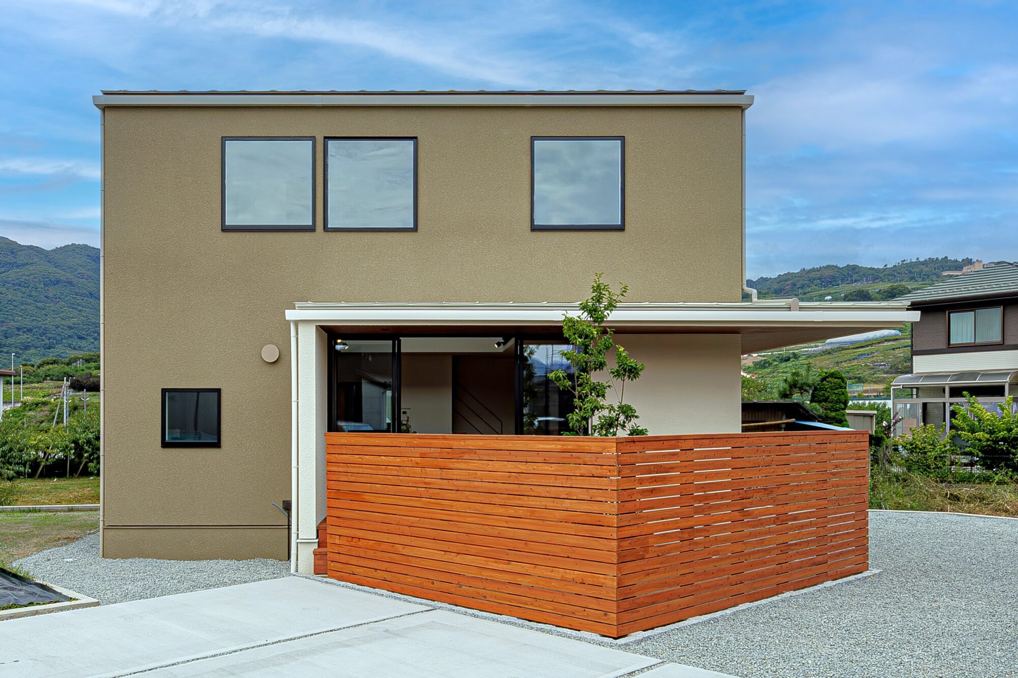 ファサードにL型庇を設けることで、スタイリッシュな印象に。庇の奥行きを深くすることで、雨を防ぎ太陽の光をコントロールし、夏の日差しが室内に直接入らないことで省エネ効果も高めます。