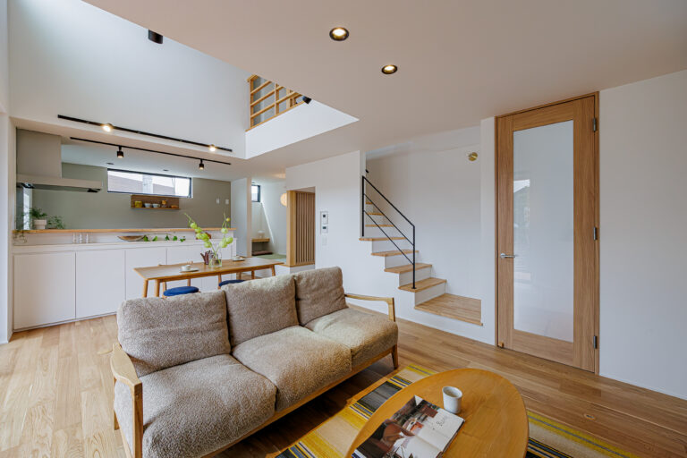 リビングに吹き抜けや勾配天井を設けて開放感を演出。光や風を家中に廻らせることに加え、視線の抜けを意識し、暗い場所を作らないことで、視覚的にも開放感が生まれます。