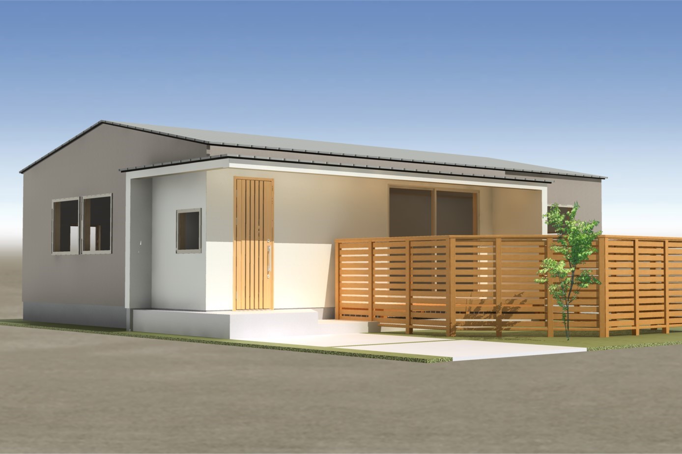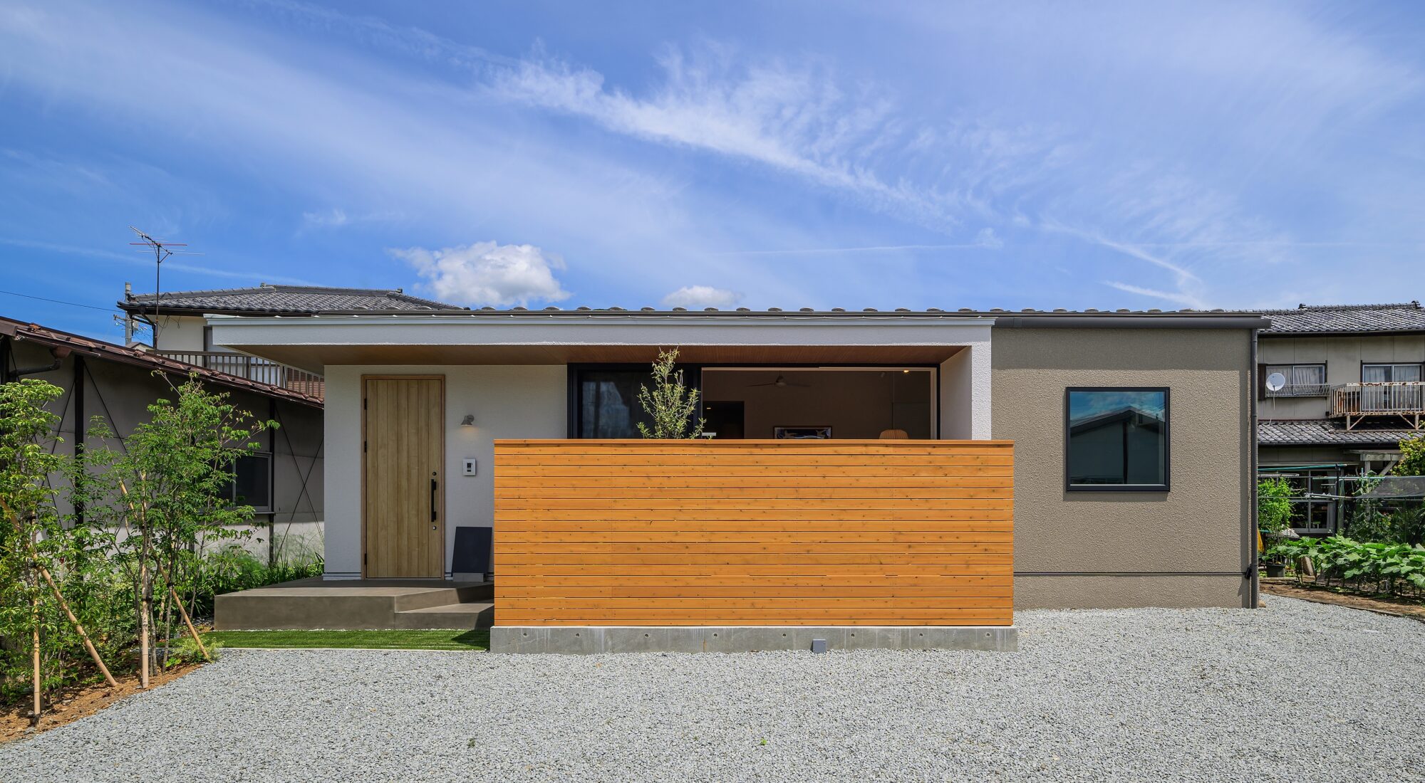 外観は、ナチュラルカラーの塗り壁を基調とすることで、時を経ても美しく、柔らかい印象に。ウッドフェンスなど一部にアクセントとして板張りを施し、上質な佇まいを演出しています。