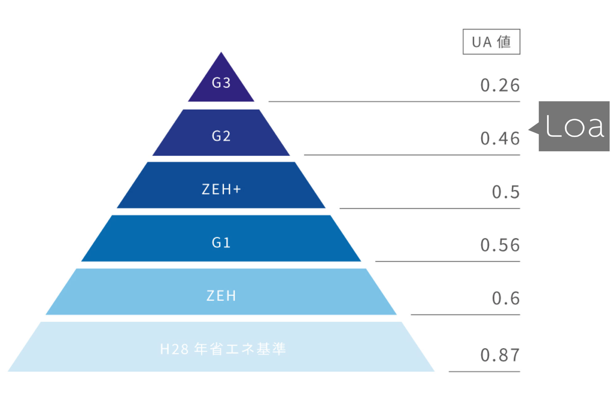 イクマホームでは、断熱性能等級6(HEAT20・G2グレード)以上の性能を基本としています(Ua値0.46以下)。