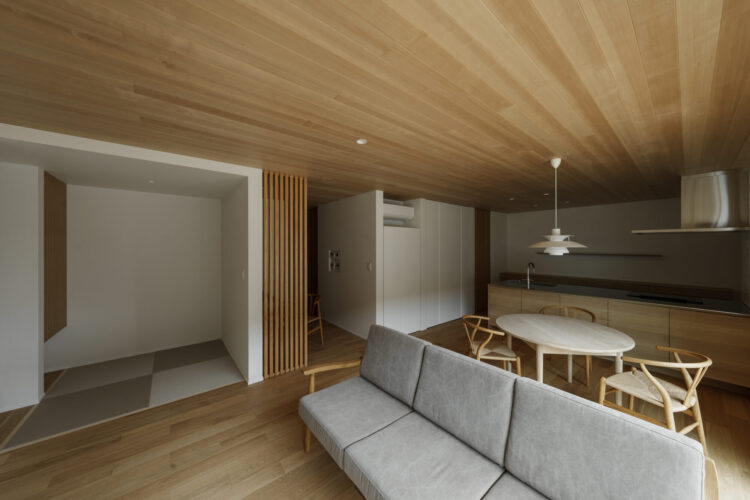 リビングは床の高さを少し下げたダウンフロアを設けることで、ほどよい落ち着きと遊び心を感じられるくつろぎの空間になっています。
