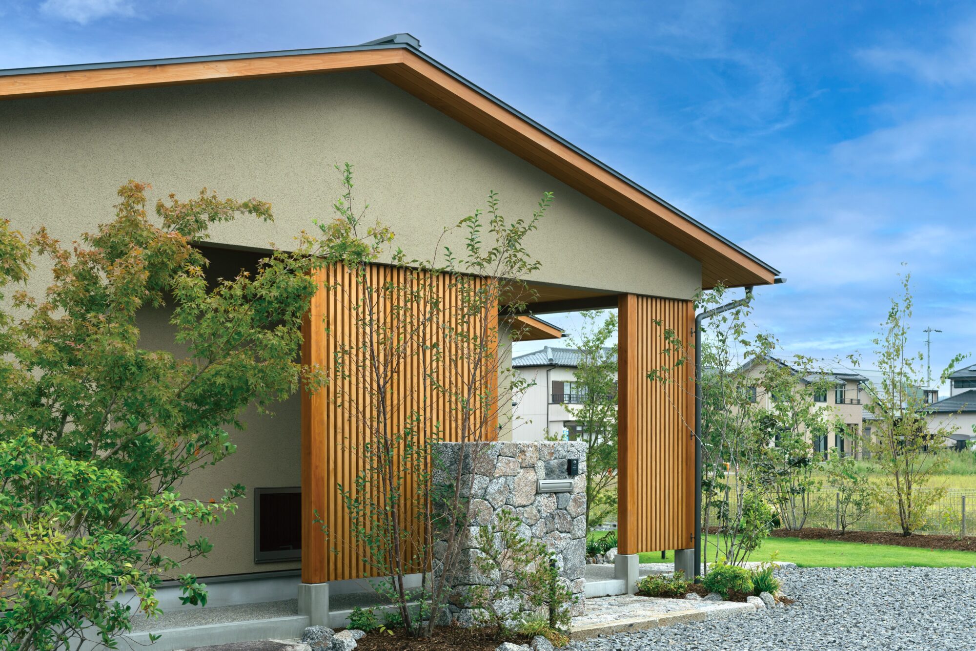 外壁はガルバリウム鋼板と杉板の鎧張りで仕上げ、住み込むほどに味わいの増す自然素材を使用し風景と調和するデザインに。