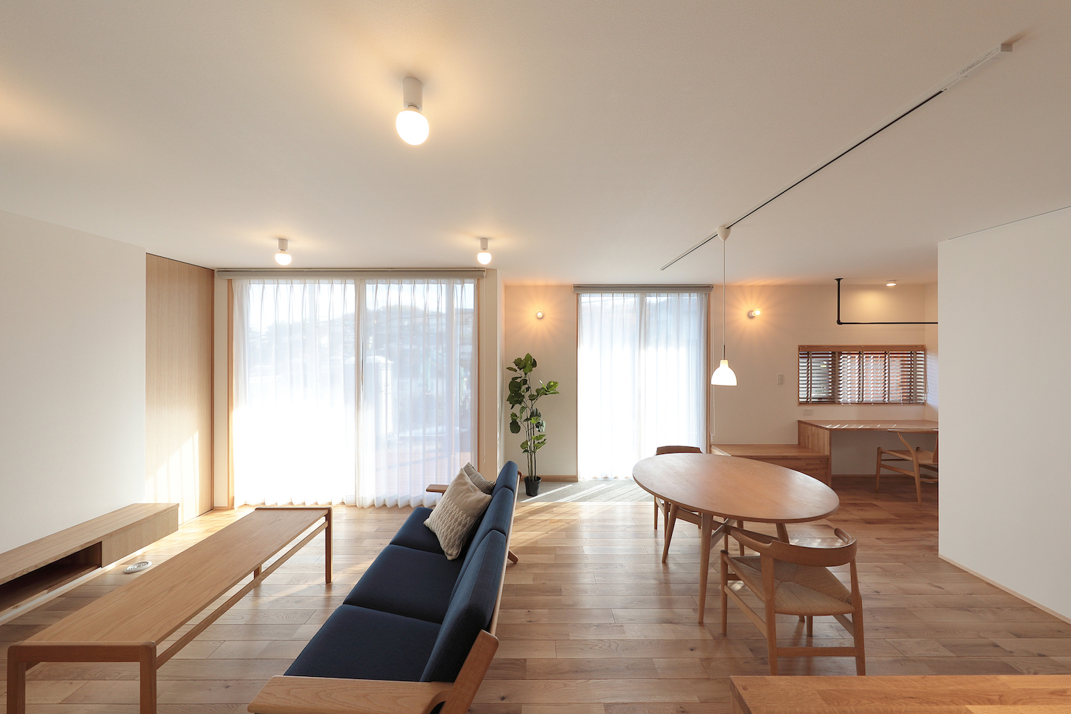 白い塗り壁と木のコントラストで上質感のある外観。芝生の庭空間にはシンボルツリーを植えることで、室内からも庭を愉しめるように。リビングから続く広々としたウッドデッキでは、様々な暮らし方が楽しめます。