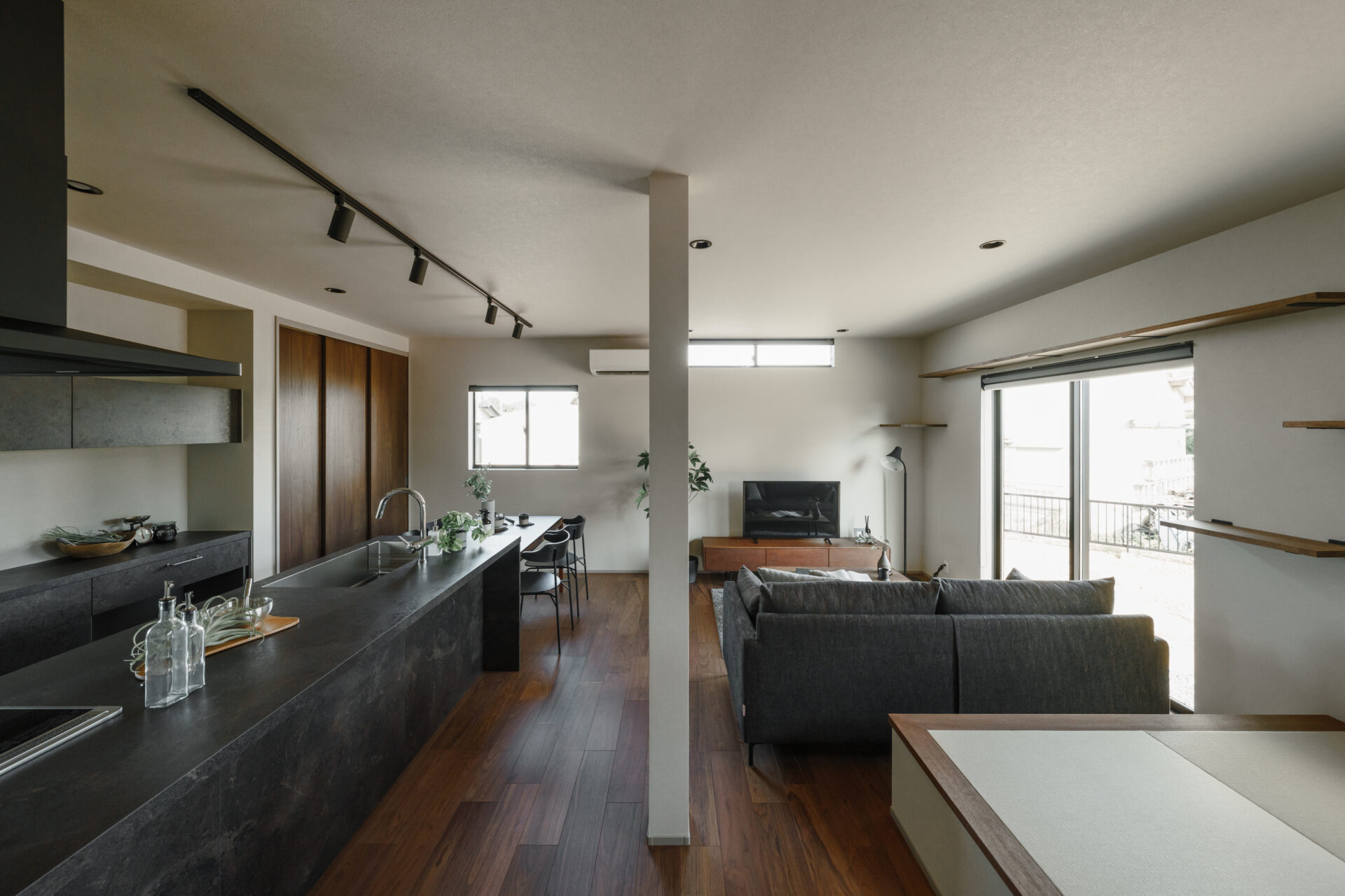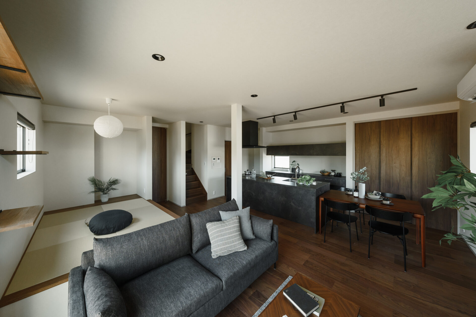 広々とした22畳のLDKは、回遊できるアイランドキッチンやほっと一息つける小上がりの畳スペースを設けることでメリハリのある空間に。自然と家族が集まり、くつろげる、心豊かな時間をかなえています。