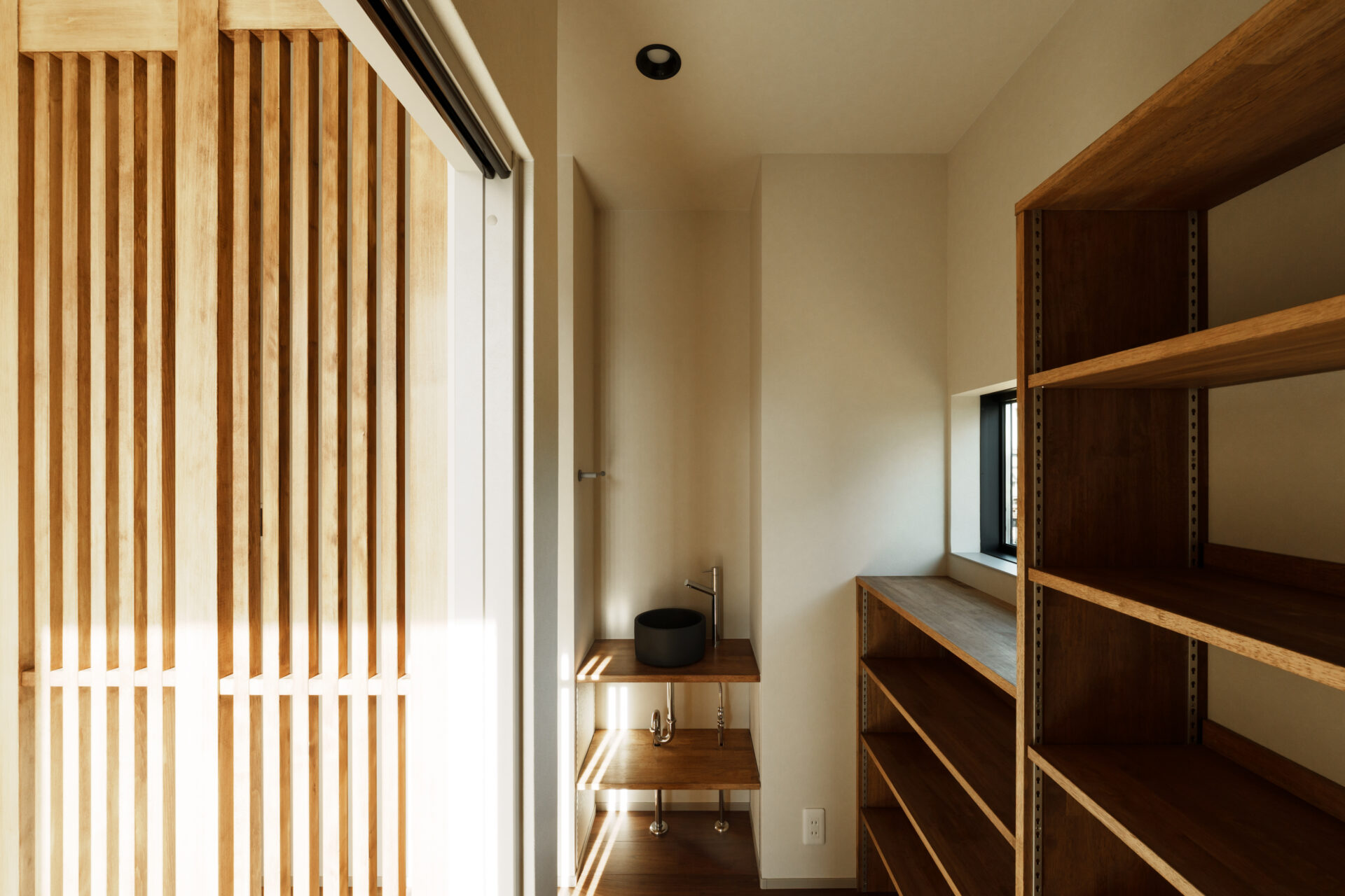 シューズクロークと手洗いのある玄関 猫ちゃんの安全を考え設置した格子戸はデザインにもこだわりを